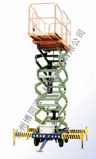 剪叉式液压升降平台:该产品适用于各行业高空设备安装、检修等可移动性高空作业。根据不同要求可选择不同动力形式(如:三相交流电源、单相交流电源、直流电源和内燃动力等),加配上手动液压装置,可在停电或无电源场所照常升降工作,并可加伸缩平台,在平台长度不足时可延伸至所需位置,从而提高工作效率。是现代高大建筑、设备之理想配备产品,是高空安全文明生产之必备。